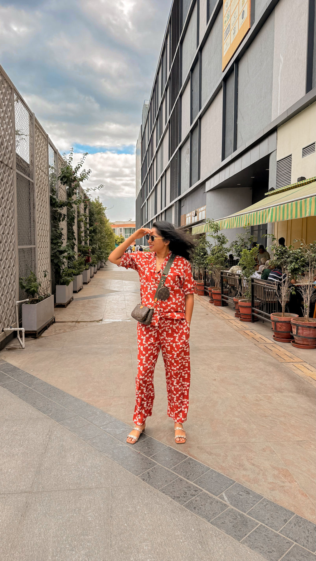 Pair it with nude or tan block heels and a statement sling bag or textured crossbody. Add soft curls and minimal gold jewelry for a polished day-out look.