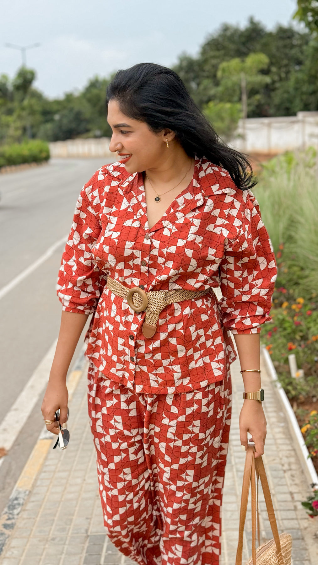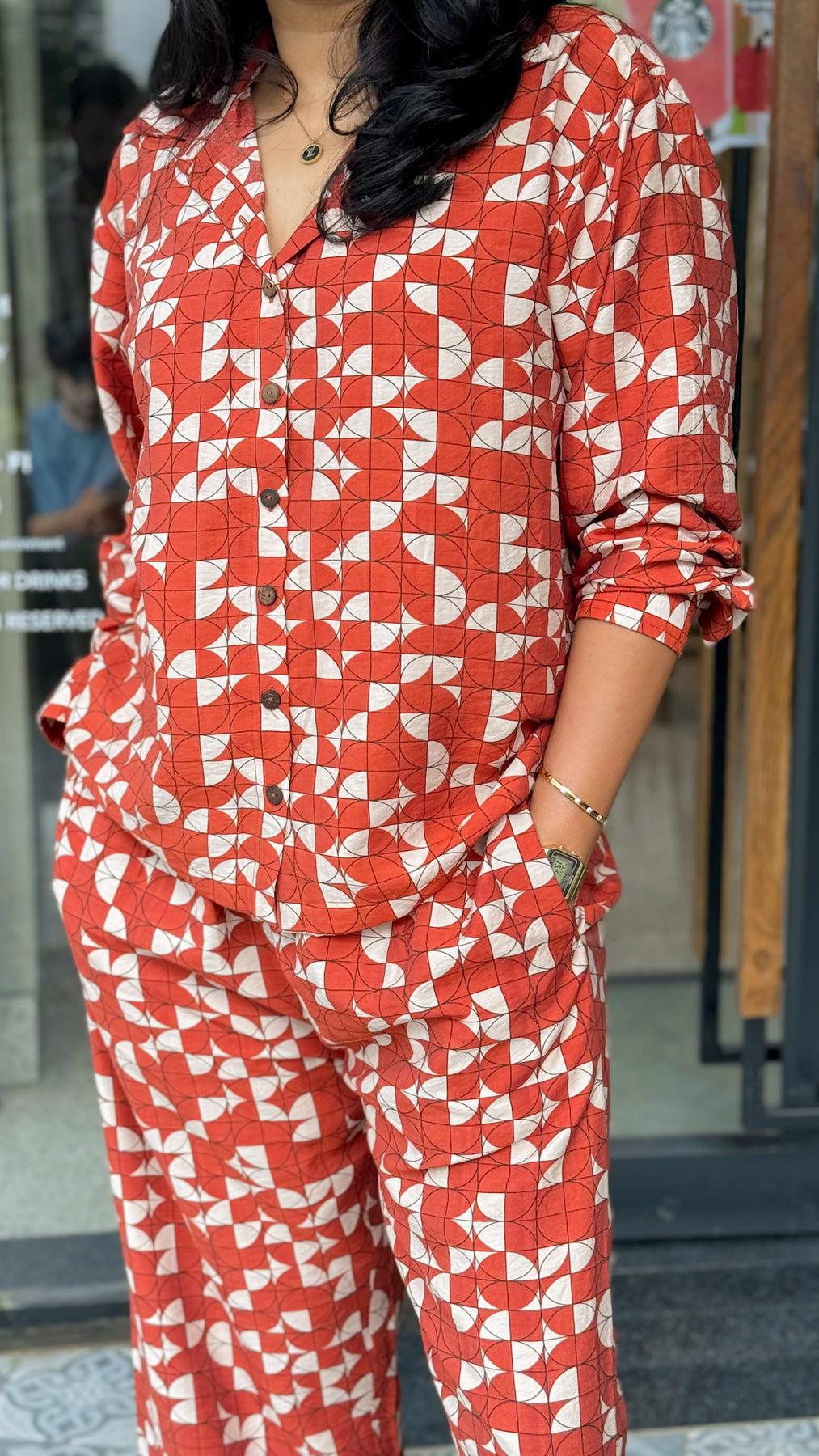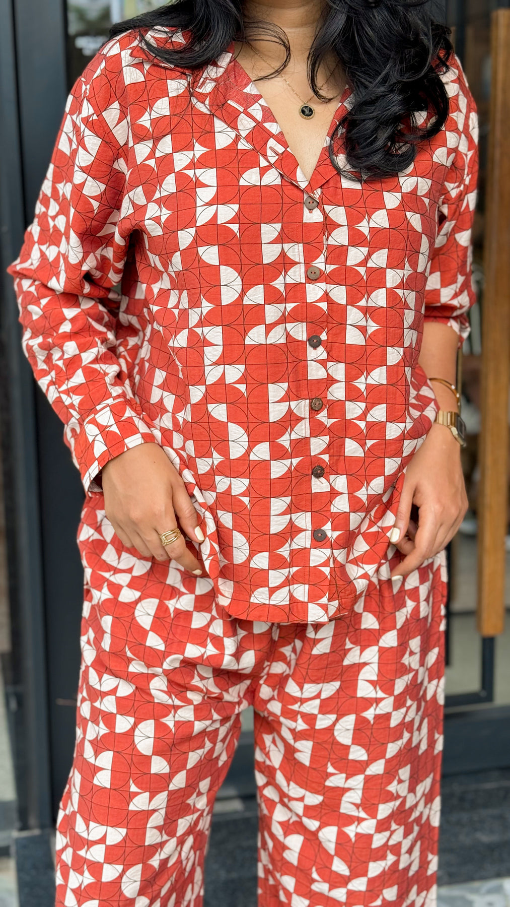 Effortlessly bold, The Rust Co-ord Set brings together comfort and confidence in one easy look. Crafted from breathable fabric in a statement terracotta-red hue, this two-piece set features a geometric print with abstract white shapes that add playful energy to your everyday wardrobe. The relaxed-fit shirt with a notch collar pairs seamlessly with the easygoing straight-cut trousers, offering a chic silhouette without compromising comfort.